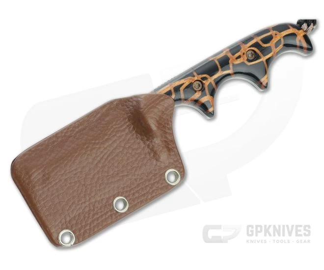 Alan Folts Custom Minimalist is a small everyday carry fixed blade made for maximum function with minimal size. The lightweight, well-balanced design has a small footprint, making it a perfect choice for discreet everyday carry. This version comes with gold and black acrylic scales, anodized titanium hardware, a hand rubbed satin CPM-154 cleaver blade and leather textured Kydex sheath.