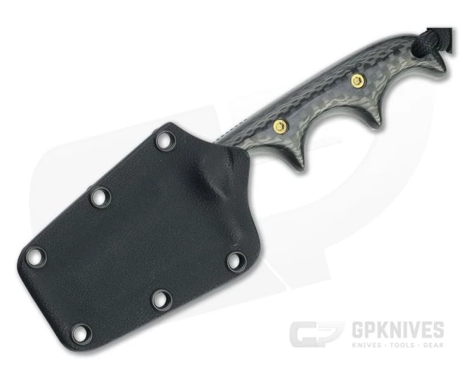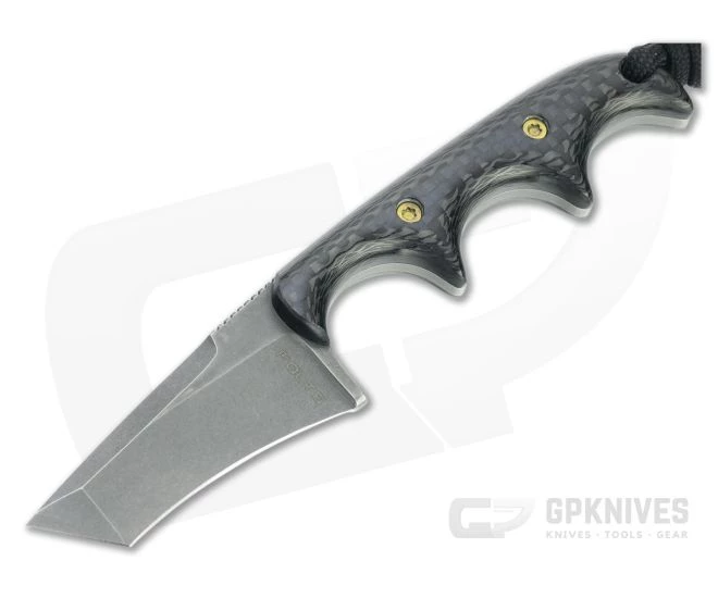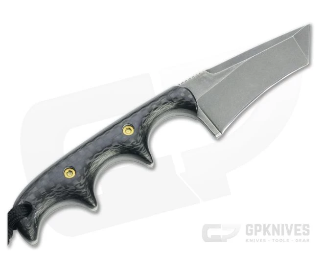 Alan Folts Custom Minimalist is a small everyday carry fixed blade made for maximum function with minimal size. The lightweight, well-balanced design has a small footprint, making it a perfect choice for discreet everyday carry. This version comes with carbon fiber handles, gold anodized titanium hardware and a tumbled CPM-154 recurve Tanto blade.