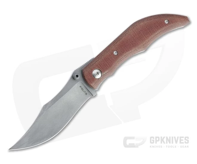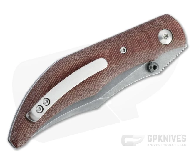 Blade:Â A blend of clip point Bowie and sweeping scimitar, the CPM 154 blade has a deep thumb scoop on the spine, jimped thumb ramp and index choil for traction and control. The already eye-catching profile is further enhanced with a rugged tumbled finish while the razor sharp recurve hollow grind and false edge swedge deliver powerful cutting potential. Bronze washers operation is smooth with ambidextrous opening via dual thumb studs or spine jimping.