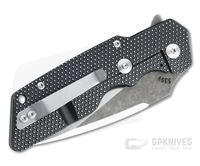 Blade:Â The S30V Tanto blade comes with a rising hollow grind and long spine swedge delivering amazing slicing and piercing power with solid durability. The Tanto is great a piercing powerhouse and works well for flat surface utility cutting. Grinds are bright satin contrasted by blackwashed flats and spine for a handsome two-tone look. Index flipper deployment is fast and smooth thanks to a ceramic bearing pivot.