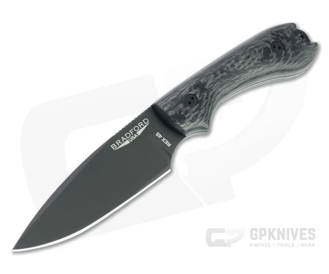 The Bradford Guardian3 is a compact, American made, everyday carry fixed blade that makes a perfect belt-carry companion for urban or outdoor use. Built to replace the modern EDC folding knife, the Guardian3 has a compact size that is easy to carry while still providing plenty of edge for your cutting needs. This GPKnives Exclusive has a false edge blade of black DLC coated CPM Rex 45 tool steel and 3D contoured carbon fiber handle scales.
