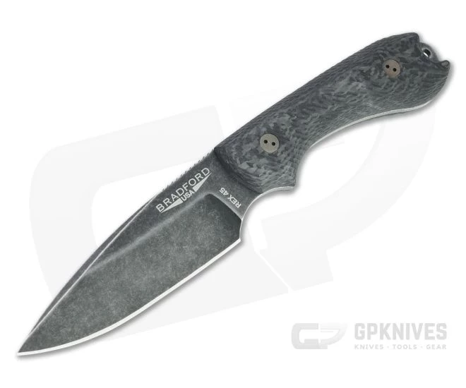 The Bradford Guardian3 is a compact, American made, everyday carry fixed blade that makes a perfect belt-carry companion for urban or outdoor use. Built to replace the modern EDC folding knife, the Guardian3 has a compact size that is easy to carry while still providing plenty of edge for your cutting needs. This GPKnives Exclusive has a false edge blade of Nimbus finished CPM Rex 45 tool steel and 3D contoured microtextured carbon fiber handle scales.