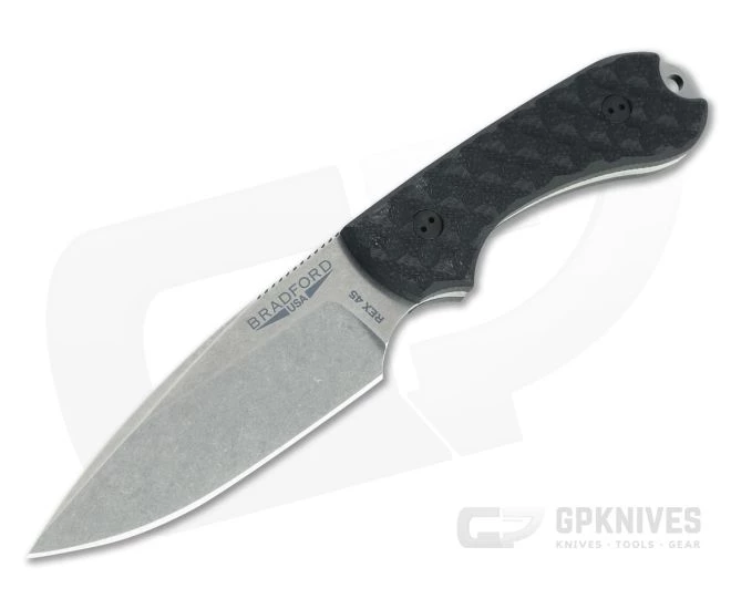 The Bradford Guardian3 is a compact, American made, everyday carry fixed blade that makes a perfect belt-carry companion for urban or outdoor use. Built to replace the modern EDC folding knife, the Guardian3 has a compact size that is easy to carry while still providing plenty of edge for your cutting needs. This GPKnives Exclusive has a false edge blade of stonewashed CPM Rex 45 tool steel and black G10 handle scales.