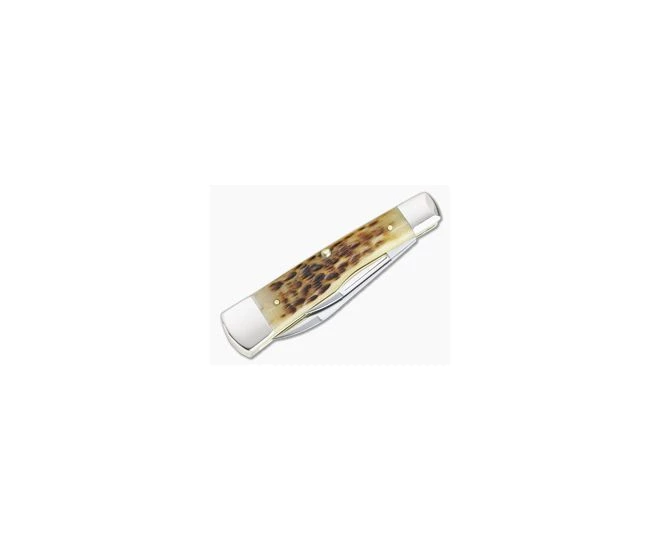Reminiscent of an actual gun stock, the large Case Gunstock pattern is based on the Bartender’s Knife with a “130” pattern frame and two-blade configuration. This version comes with Pocket Worn Peach Seed Jigged Antique Bone covers and two satin polished Tru-Sharp stainless steel blades: one spear and one pen.