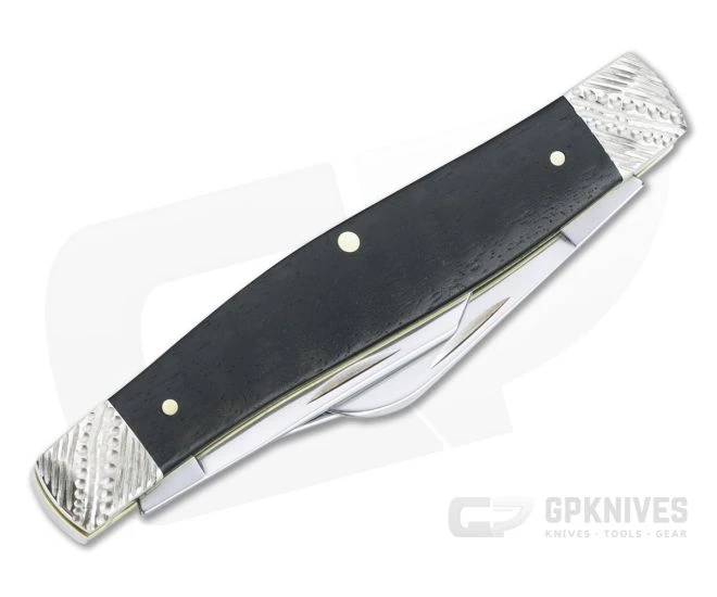 Handle: Smooth, black Ebony wood covers are fit between two sets of nickel silver bolsters that have been tool worked for a textured feel and custom look. Ebony has a warm, organic feel in hand with solid durability and weather resistance. The covers are attached with brass pins to brass liners in the traditional style. The front cover sports a Case Bow Tie shield while dual stainless steel back springs deliver smooth, simple and secure slip-joint operation.