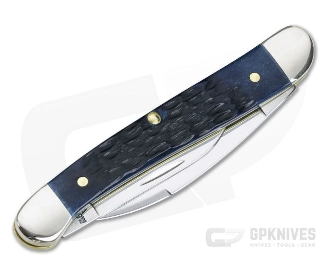 Case Mini Copperhead knife with Navy Blue Jigged Bone handles and rounded bolsters makes for a great companion. This pattern features two Tru-Sharp stainless steel blades, a wharncliff and pen with a mirror polish finish and nail-nick openers. The bone handles have been attached to brass liners with brass pins and also boasts a red oval Case Shield on the front side. Brand new directly from W.R. Case & Sons.