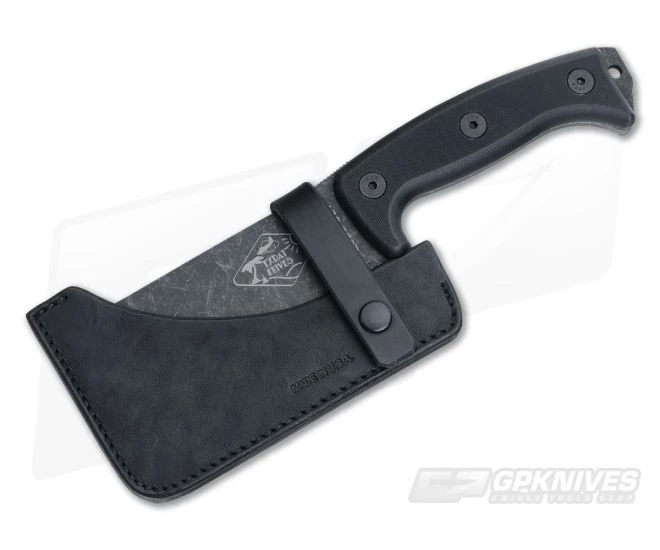 The CL1 Cleaver ships in an ESEE box with a USA Made black leather sheath with strap button snap closure.Â
