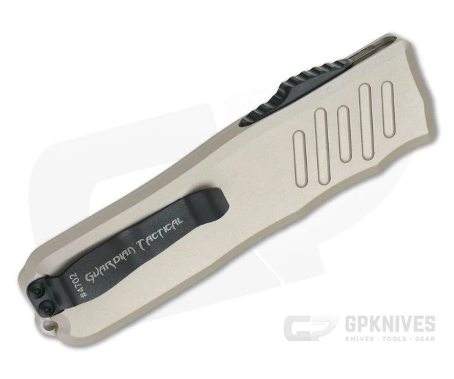 The Recon-035 is a modern and innovative, double action, out the front automatic that is perfect for everyday carry. With patented steel thumb slide base and floating blade construction the Recon-035 is smooth and reliable in its operation while having minimal play and a rock solid feel. This Tactical version comes with a black coated, double edge Elmax blade, black hardware and desert tan handle.