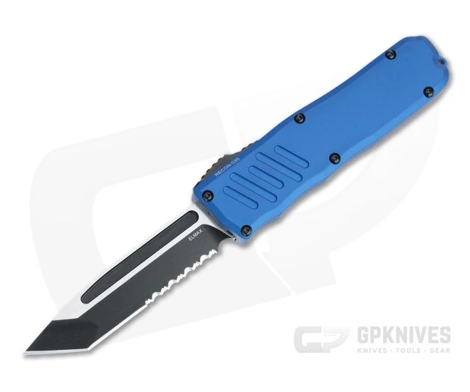 The Recon-035 is a modern and innovative, double action, out the front automatic that is perfect for everyday carry. With patented steel thumb slide base and floating blade construction the Recon-035 is smooth and reliable in its operation while having minimal play and a rock solid feel. This version comes with a two-tone black Elmax partially serrated Tanto blade and blue handle with black hardware.