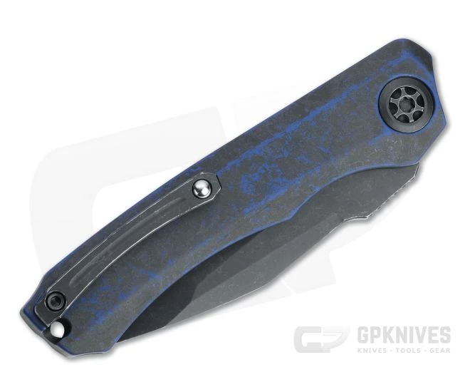 Handle:Â Milled from a single billet of 6061 aluminum the integral chassis houses the blade and button lock mechanism in this durable yet lightweight build. The aluminum handle has a tumbled “Breakthrough Blue” finish that complements the blade. The button lock is smooth and reliable with frag pattern texture for positive engagement and additional frag milling on the front of the handle for added traction. Construction includes a carbon fiber bolster, black titanium hardware and matching clip.