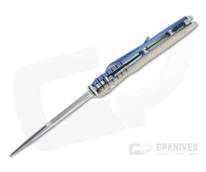 Handle: Titanium frame and liner come in a matching blue anodized stonewashed finish that hides wear and looks great while the textured G10 scale and jimping provide a secure grip. Equipped with a steel lock face insert, the integral frame lock has solid lockup and smooth operation for safe use. The Hinderer LockBar Stabilizer, titanium clip insert and hardware make this a fully customizable modular design.