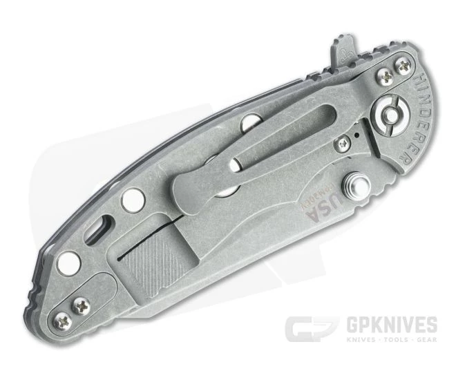 Handle:Â Titanium frame and liner come in a matching low-profile Working Finish that hides wear while the textured G10 scale and jimping provide a secure grip. Equipped with a steel lock face insert, the integral frame lock has solid lockup and smooth operation for safe use. The Hinderer LockBar Stabilizer, titanium clip insert and hardware make this a fully customizable modular design.