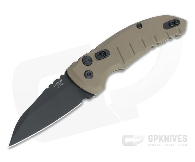 The Hogue A01 MicroSwitch is a small, hard-hitting button lock automatic. Premium materials paired with precision American manufacturing make the MicroSwitch ideal for compact daily carry. This version comes with a black Cerakote coated CPM-154 Wharncliffe blade and matte FDE (flat dark earth) aluminum handles.