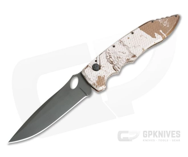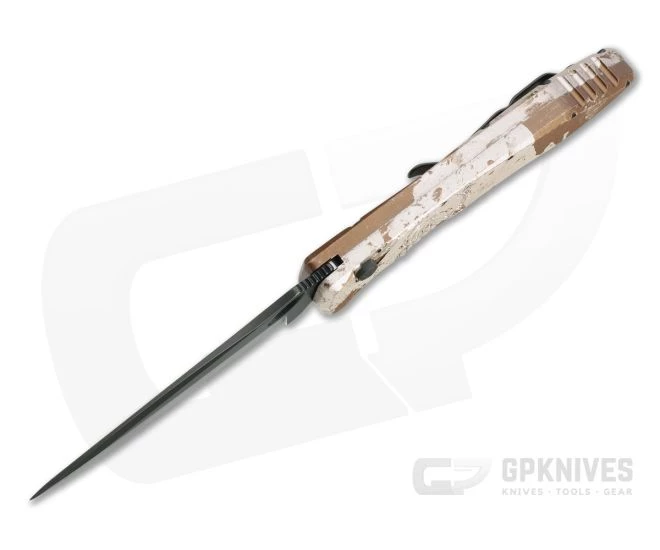 The Piranha Knives Predator Mini is a more compact version of the robust and capable spear point automatic. It retains the same rugged S30V blade, 3D milled aluminum handle and rock solid button lock automatic mechanism and comes in at 2.5 ounces with a nearly 3.5 inch blade! Perfect for a daily carry you can count on. This Tactical version comes with a black PVD coated blade and Desert Camo handle.
