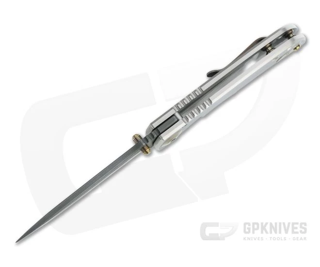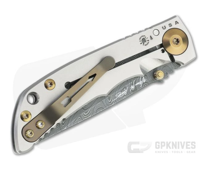 Blade:Â Coming in at just under 3.25 inches, the classic drop point blade is made from Nichols stainless Damascus with a top swedge and high saber grind for strength balanced with daily carry performance. Acid etched to bring out the unique look of the pattern welded steel, the blade offers an eye-catching look with modern performance. Deployment is smooth on durable bronze washers via dual titanium thumb studs. Aggressive jimping on the thumb ramp offers added traction and a point for indexing.