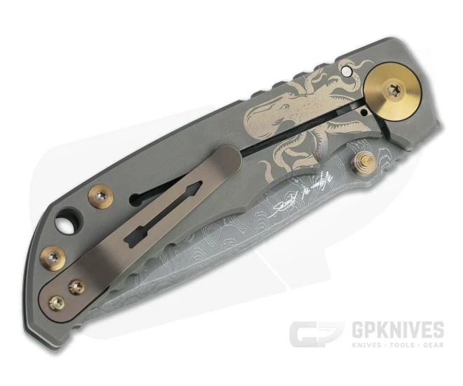 Blade:Â A classic, utilitarian drop point blade is made from Nichols stainless Damascus with a top swedge and high saber grind for balanced performance and durability. Acid etched to bring out the unique look of the pattern welded steel, the blade offers an eye-catching look with modern performance. Riding on rugged bronze washers the blade deploys fast and smooth via dual titanium thumb studs. Aggressive jimping on the thumb ramp offers added traction and a point for indexing.
