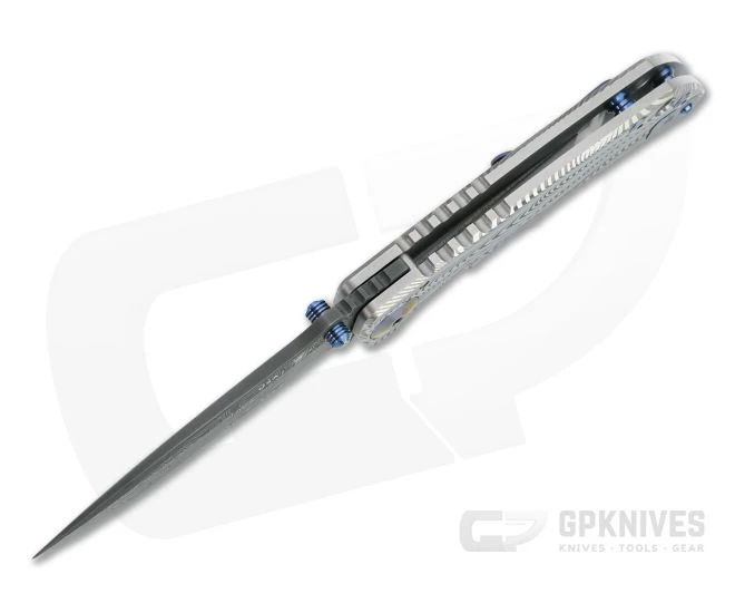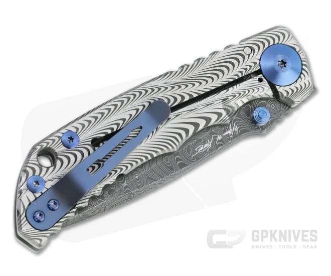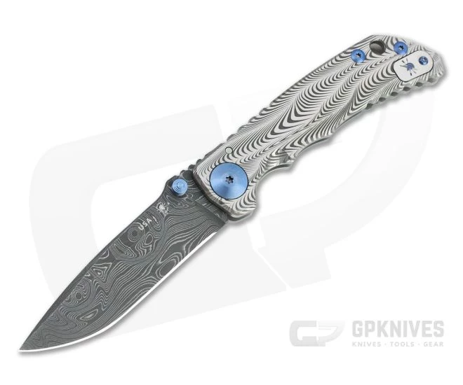 Blade:Â A classic, utilitarian drop point blade is made from Nichols stainless Damascus with a top swedge and high saber grind for balanced performance and durability. Acid etched to bring out the unique look of the pattern welded steel, the blade offers an eye-catching look with modern performance. Riding on rugged bronze washers the blade deploys fast and smooth via dual titanium thumb studs. Aggressive jimping on the thumb ramp offers added traction and a point for indexing.