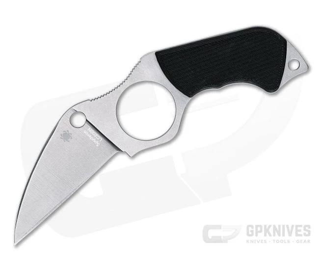 Taking inspiration from the groundbreaking innovations of French knife maker Fred Perrin, Spyderco founder Sal Glesser designed the Swick as a purpose built personal-defense tool. The Perrin inspired index finger hole is the most iconic feature and locks the knife into the user’s hand for superior security in the hand. The Large Swick 5 is sized for a large hand with a 26 mm diameter hole, black G10 scales and stonewashed, plain edge LC200N Wharncliffe blade.