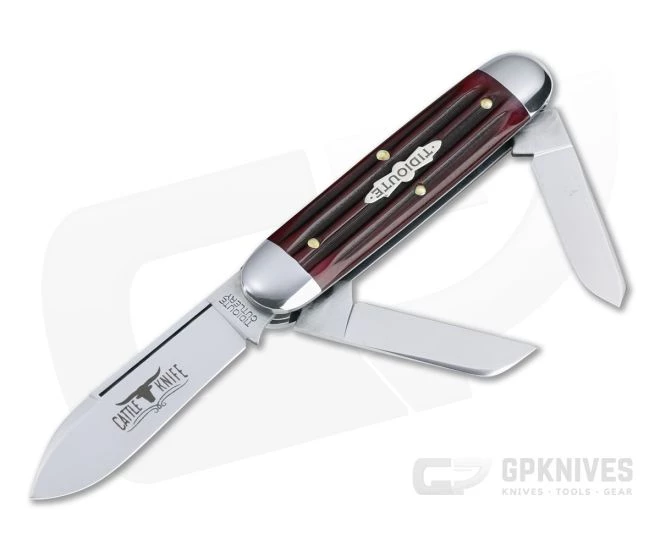 The Tidioute #35 Cattle Knife from Great Eastern Cutlery is a premium example of the classic three-blade Jack knife pattern with a generous symmetrical handle and modern, all steel build. This version comes with satin finish carbon steel blades (spear, Spey, and Sheepsfoot), steel liners and bolsters and ox blood jigged bone covers.