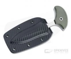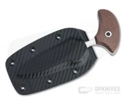 Ergonomically designed brown canvas micarta handle scales fit over red fiber liners and are connected to the handle via allen screw construction. The handle also features a bow drill divot for making primitive type fires, and thumb scallops at the hilt for a better controlled grip when carving or skinning. A slightly exposed pommel helps to reduce impact when batoning with the knife and also has a specially designed B.O.B. scraper for safely scraping Ferro rods.