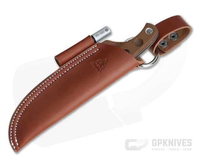 Sheath:Â Carries via a double-stitched, brown leather belt sheath with drop loop and Ferro rod (included) holder.