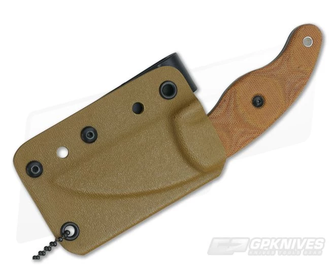 Handle:Â The tang construction is supports contoured, natural canvas Micarta handle scales that offer durability and traction with contrasting black liners for a very handsome look. Jimping on the spine paired with the negative blade angle and ergonomic handle design deliver a high level of control and power in a compact, sub-4oz. package. Two allen bolts attach the scales with hollow aluminum tube provided for lanyard attachment.