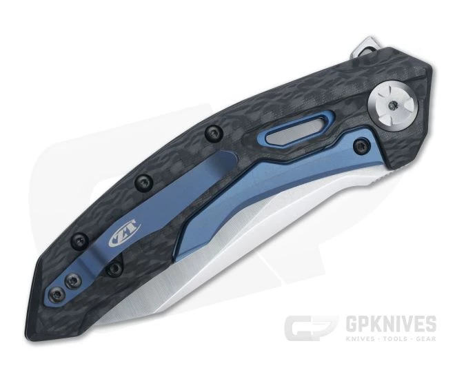 The ZT 0762 delivers a top-of-the-line daily carry folder with two of Zero Tolerance’s most innovative features: the Tuned Detent System and Sub-Frame lock. A modified Sheepsfoot blade and carbon fiber handle scales offer a lightweight, high performance folder with style to spare. The 0762 has a two-tone 20CV blade and blue anodized titanium liners with matching Sub-Frame Lock, barrel spacers and clip.